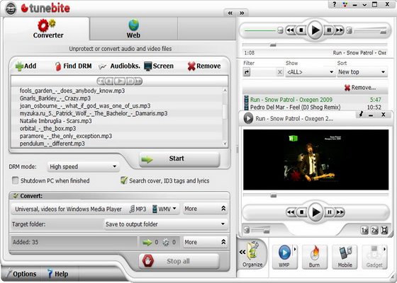 Tunebite - программа, позволяет делать копии с музыкальных файлов, защищенных от копирования. Применяемые технологии цифрового управления авторскими правами (DRM) не дают возможности ни конвертировать их в MP3, ни записывать на компакт-диск, ни проигрывать где-либо, кроме того компьютера, на который этот файл был закачан. Программа позволяет записывать всё, что бы вы ни закачали на компьютер в защищённых цифровых форматах. Возиться с настройками этой программы не нужно, она автоматически определит необходимые для записи параметры звуковой карты. Кроме всего перечисленного, данная программа позволяет записывать защищенное аудио и видео на CD/DVD, изготавливать рингтоны для мобильных телефонов и переносить файлы на мобильные устройства.