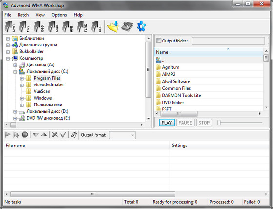 Advanced WMA Workshop - конвертер цифровой звукозаписи с интерфейсом Windows Explorer-like, позволяетет Вам преобразовать WMA, MP3, AC (M4A, M4B), OGG Vorbis, WAV PCM, APE и звуковые файлы FLAC из одного формата в другой включая переосуществление выборки. Работает как с отдельными файлами, так и в пакетном режиме. Также Вы можете транскодировать CD используя тот же самый интерфейс, как и любой другой файл поддерживаемого формата, непосредственно в OGG Vorbis, MP3, AAC (M4A), WAV PCM, APE, FLAC или любой тип формата WMA. Поддерживается WMA9, есть редактор ID3-тегов (ID3V2) и CD-граббер. Кроме этого, умеет преобразовывать MP3 и OGG в WAV PCM, а WMA - в MP3 (используется LAME-encoder).