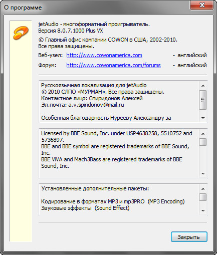 jetAudio - популярный проигрыватель мультимедиа файлов. Программа поддерживает огромное число форматов, среди которых: WAV, MP3, MP3Pro, OGG, WMA, MPG, AVI, WMV, MIDI, RM и другие. При помощи этой программы можно не только слушать и смотреть медиафайлы, а также накладывать звуковые эффекты, изменять скорость просмотра видео, оцифровывать аудио диски, преобразовывать файлы из одного формата в другой и многое другое. Разработкой данной программы занимается компания COWON известная в первую очередь своими аудио-плеерами (материальными). Такой функциональности, как у бесплатной версии плеера jetAudio подчас не бывает и у платных проигрывателей. Кроме всех своих функций, данный плеер обладает очень симпатичным и удобным интерфейсом, а также поддерживает работу с субтитрами и Flash-плеерами.