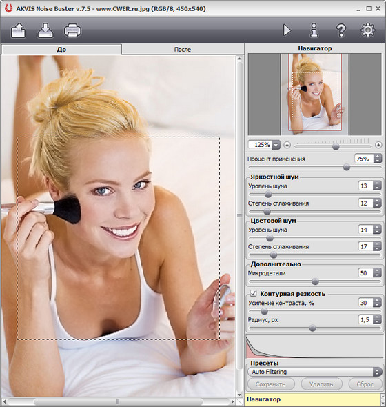 Noise Buster подавляет шумы матрицы цифровой камеры и шумы, появляющиеся при сканировании фотоснимка, уменьшает зернистость и устраняет неоднородные цветовые пятна на изображении, сохраняя детали и резкость границ. Программа убирает как яркостной шум, так и цветовой (хроматический). Первый проявляется в виде искажающих элементов, отличающихся по яркости (например, неровности на коже), второй — в виде маленьких пятен, имеющих различие в цвете (например, неуместные пятна красного или синего цвета). Noise Buster справляется со своей задачей и в том, и в другом случае.