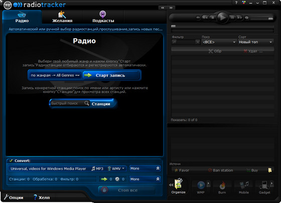 RadioTracker - программа использующая около 15.000 интернет-радио станций для прослушивания и записи музыки в формате mp3. Возможности программы довольно велики: поиск музыки, разбивка на разные жанры (Dance/House, Pop, Rap, Rock, Techno, Metal, Jazz, 80s, 70s и т.д.), во время сохранения треков сохраняется и вся информация об исполнителе и другая полезная информация, возможность использования фильтров удаления рекламы и прочего мусора на радио. Программу Radiotracker обслуживает база данных, в которой хранятся файлы восьми тысяч онлайн-радиостанций со всего мира. Больше, по сути, и не нужно, потому что здесь представлены радиостанции буквально на любой музыкальный вкус.