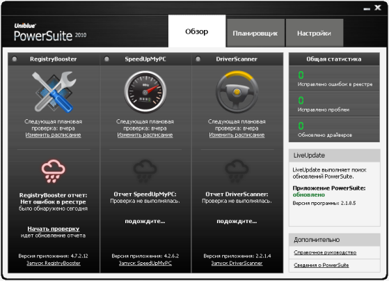 Uniblue PowerSuite 2010 - является полным решением для повышения производительности компьютера. Слияние RegistryBooster, DriverScanner и SpeedUpMyPC в рамках единого интерфейса, PowerSuite повышает и защиту уязвимых групп, но очень важных элементов системы привязаны к скорости и стабильности.