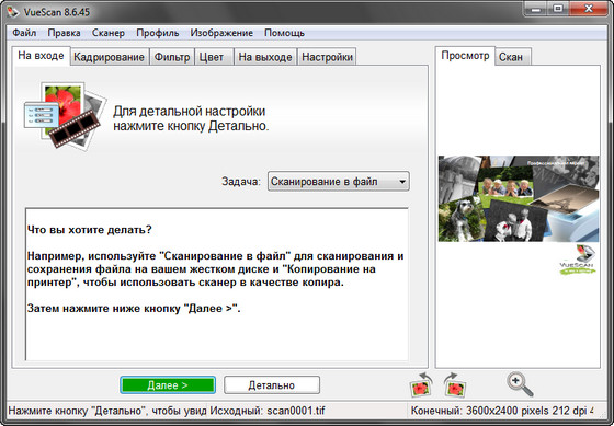 VueScan Pro - программа для работы со сканерами HP, Minolta, Nikon, Polaroid, Epson, Canon и другими. Может работать с внутренней глубиной цвета. VueScan поддерживает автоматическую и ручную настройку большинства параметров и пакетный режим сканирования. Поддерживается более 500 моделей сканеров с определенным перевесом в сторону слайд-сканеров — Nikon, Minolta, Polaroid, Microtek, Epson. Предусмотрено автоматическое удаление дефектов изображения за счет канала инфракрасного сканирования и многопроходное сканирование с последующим усреднением результата — для подавления собственных шумов сканера. Имеются фильтры подавления зерна, нерезкого маскирования и удаления паразитного оттенка оригинала. Есть средства ручной корректировки динамического диапазона и градационной характеристики (независимо по каналам R, G, B).