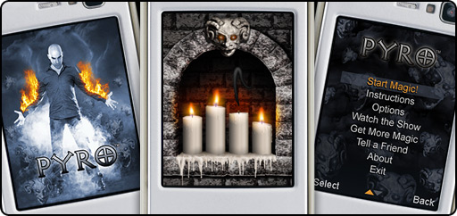 Pyro - фокус со свечами. После запуска, вы увидите на экране четыре свечи. Пусть ваш друг выберет одну свечу, после этого вы берёте телефон, зажигаете свечки, затем дуете на экран и погаснет именно та свеча, которую выбрал ваш друг... Размер экрана: 240х320.