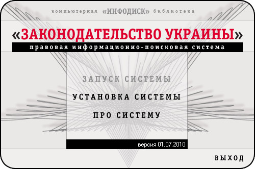 Информационно-поисковая система «Инфодиск: Законодательство Украины» разработана как мощный инструмент для ежедневной работы с правовой базой и поиска нужного нормативного акта в считанные секунды. Содержит законодательную базу Украины - более 120 000 документов: все Кодексы, законы, документы практически всех органов законодательной и исполнительной власти, международные договора и соглашения в действующих редакциях. Для удобства пользователей База законодательства систематизирована по трем классификаторам: по издающему органу, по типу документа, по тематической и отраслевой принадлежности документов. Выделены блоки: Новости законодательства, государственные классификаторы, типовые договора и бланки, справочники.
