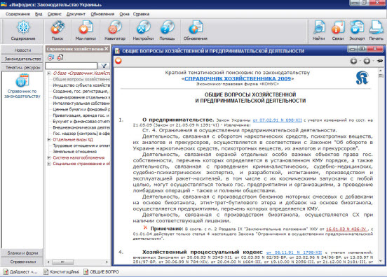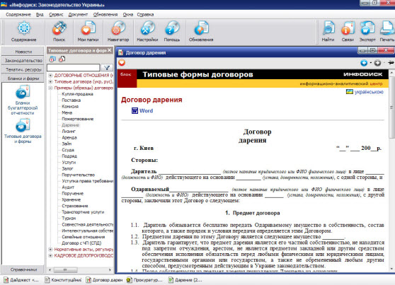 • общее законодательство: представлена законодательная база Украины - 120.000 документов практически всех органов законодательной и исполнительной власти, как в действующих, так и в предыдущих (с 2000 года) редакциях;