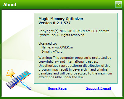 Magic Memory Optimizer - предназначена для решения трудных и критических проблем возникающих в оперативной памяти компьютера. Память - самый драгоценный ресурс на вашем компьютере; если ее становится недостаточно, ваш компьютер начинает медленно работать, "зависать" или наступает крах, - падение системы. Сама же Windows не управляет памятью на должном уровне. Со временем, не имеет значения какой объем памяти у вас имеется, Windows постепенно для своей работы и прикладных программ отбирает остатки свободной памяти, что легко может привести вашу систему к краху. Magic Memory Optimizer решит все эти проблемы, высвобождая и восстанавливая беспечно растраченную системой память для ваших программ.