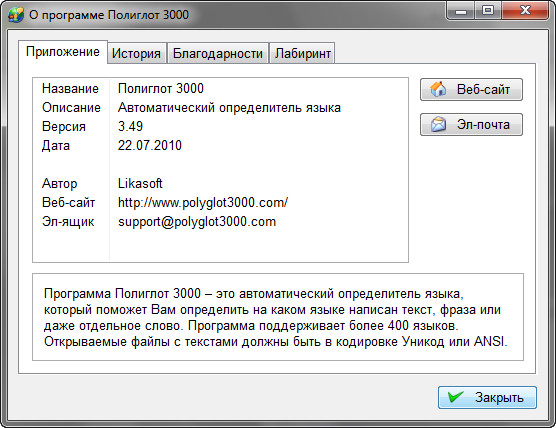Полиглот 3000 (или сокращённо П3000) – это автоматический определитель языка, который предназначен для быстрого и корректного определения того на каком языке написан введённый Вами текст. Программа работает в операционных системах Windows 95/98/NT/ME/2000/XP/Vista/7.
