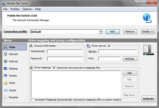 Windows слабо приспособлена для работы с несколькими сетевыми подключениями одновременно, и необходимость менять опции интернет-соединения вручную каждый раз, когда вы хотите перейти с локальной сети на ADSL-модем, мягко говоря, неудобно. Еще хуже обстоят дела у мобильных пользователей, которые постоянно в движении и вынуждены заново настраивать параметры подключения к интернету, sharing и т.д. на каждом новом месте. Mobile Net Switch позволит с легкостью избавиться от всех этих неудобств. Программа умеет работать с неограниченным числом интернет-профилей и мгновенно переключаться между ними без перезагрузки ПК. Остается только внести необходимые данные (IP-адрес вашего ПК, интернет-шлюз, координаты DNS-серверов и т. д.) для каждого из профилей и навсегда забыть о подобных проблемах.