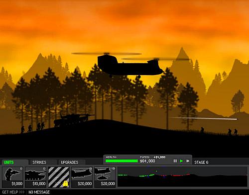 На вкладке Units расположены кнопки для создания солдат и военной техники, Strikes - ракетные и артиллерийские удары, Upgrades - улучшения которые позволяют использовать более разрушительное оружие. Не подпускайте врагов к левой границе экрана, иначе будете терять жизни.