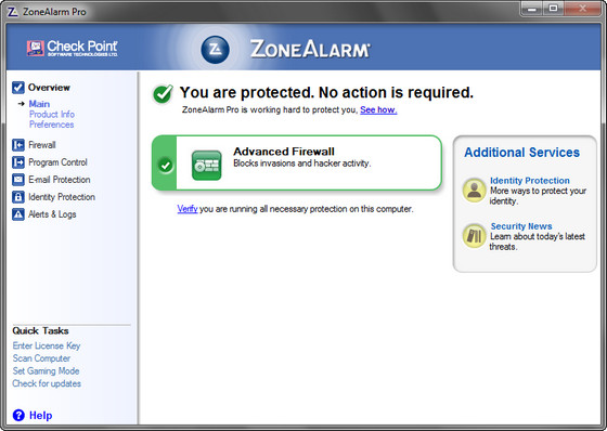 ZoneAlarm Pro - хорошо известный фаервол, предназначен для защиты компьютера от разного рода угроз при работе в интернете и локальных сетях. Программа обеспечивает отличную защиту по принципу межсетевого экрана, вплоть до возможности полного отключения всей сетевой и Интернет активности. Фаервол имеет гибкие настройки правил, которые можно настраивать самостоятельно или воспользоваться предустановленными правилами. Фильтр приложений (аксесс-лист), позволяет устанавливать права для доступа в сеть каждой программы. Имеется возможность мгновенной автоматической или ручной блокировки доступа приложений в интернет. Программа контролирует входящую и исходящую почту и может переименовывать потенциально опасные вложения и помещать их на карантин. Количество исходящей почты может быть ограничено для предотвращения массовых рассылок при заражении компьютера почтовыми червями.