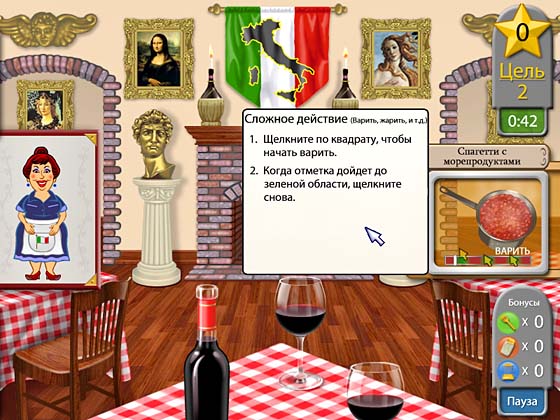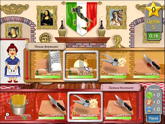 Но карьера – это еще не все. Процесс жарки, парки и взмахи разделочного ножа невероятно реалистичны! Потереть сыр, нарезать овощи, сварить суп можно только при помощи особенных движений мышки. Для каждого блюда ингредиенты смешиваются в нужной пропорции. По-моему, здесь не хватает соли и перца, да и щепотка кинзы не помешала бы. Или тебе больше по вкусу базилик? Что ж, ты повар, тебе и сковородка в руки!