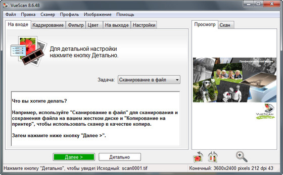 VueScan Pro - программа для работы со сканерами HP, Minolta, Nikon, Polaroid, Epson, Canon и другими. Может работать с внутренней глубиной цвета. VueScan поддерживает автоматическую и ручную настройку большинства параметров и пакетный режим сканирования. Поддерживается более 500 моделей сканеров с определенным перевесом в сторону слайд-сканеров — Nikon, Minolta, Polaroid, Microtek, Epson. Предусмотрено автоматическое удаление дефектов изображения за счет канала инфракрасного сканирования и многопроходное сканирование с последующим усреднением результата — для подавления собственных шумов сканера. Имеются фильтры подавления зерна, нерезкого маскирования и удаления паразитного оттенка оригинала. Есть средства ручной корректировки динамического диапазона и градационной характеристики (независимо по каналам R, G, B).