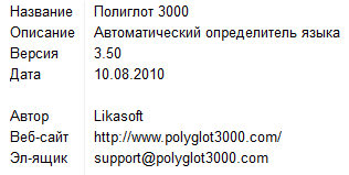 Полиглот 3000 (или сокращённо П3000) – это автоматический определитель языка, который предназначен для быстрого и корректного определения того на каком языке написан введённый Вами текст. Программа работает в операционных системах Windows 95/98/NT/ME/2000/XP/Vista/7.