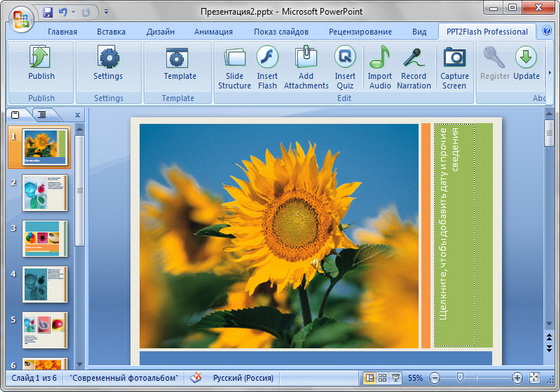 - Вставка flash фильмов и идеальное слияние их со слайдами.