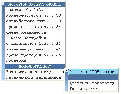 В меню Настройки можно установить опции действий по автоматической смене клавиатуры. Для Windows XP конвертация набора текста происходит автоматически – программа проверки орфографии распознает сочетания литер в соответствии с грамматикой русского или английского языков. В Windows Vista текст, набранный английскими литерами, конвертируется через выделение фрагмента текста и нажатия Ctrl+Q.