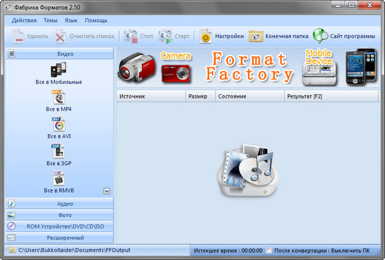 FormatFactory - многофункциональный конвертер различных файлов мультимедиа. Имеет рад дополнительных функций, превращающих FormatFactory в универсальный инструмент для работы с мультимедийными файлами разных форматов. Поддерживается конвертация популярных видеоформатов в MP4, 3GP, MPG, AVI, WMV, FLV, SWF, а также конвертация аудиоформатов в MP3, WMA, MMF, AMR, OGG, M4A, WAV. В FormatFactory есть функция преобразования изображений в форматы JPG, BMP, PNG, TIF, ICO, GIF, PCX, TGA. Среди дополнительных возможностей FormatFactory есть такие, как увеличение и вращение изображений, присвоение им тегов, а также восстановление поврежденных аудио и видеофайлов.