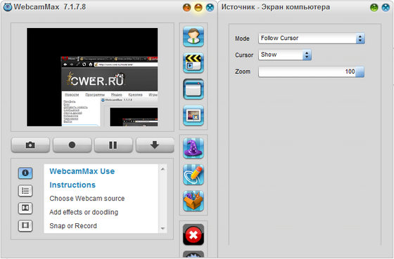 WebCamMax - продвинутая утилита для работы с веб-камерой. Программа, добавляющая изумительные видеоэффекты на все вебкамеры, даже без реальной камеры. Программу можно использовать по умолчанию в таких приложениях, как ICQ, AIM, MSN, Camfrog, Skype, Paltalk, Yahoo, ANYwebcam, Stickam. Можно настроить WebcamMax Full так, чтобы она начинала функционировать и вести трансляцию с камеры только в том случае, когда объектив зафиксирует движение.