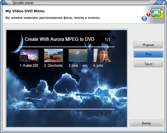 • Создание полноценного меню для DVD фильма, с возможностью выбора различных макетов, редактирования фона и текста