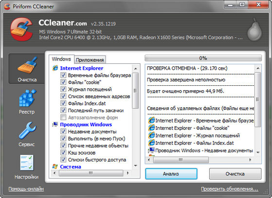 CCleaner, в зависимости от настроек, чистит следующие компоненты Windows: