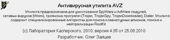 AVZ - антивирусная утилита AVZ предназначена для обнаружения и удаления: SpyWare и AdWare модулей - это основное назначение утилиты; Dialer (Trojan.Dialer); Троянских программ; BackDoor модулей; Сетевых и почтовых червей; TrojanSpy, TrojanDownloader, TrojanDropper