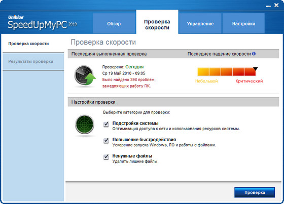 SpeedUpMyPC - программа является удобным настройщиком вашей операционной системы и обеспечивает для нее более устойчивую и быструю работу. Программа позволяет освобождать память и другие системные ресурсы, предотвращать фатальные сбои, уменьшать время загрузки и делать более эффективной связь с интернетом. Утилита также позволяет проводить мониторинг системы и дает рекомендации по ускорению запуска программ. Хотя скорость работы процессора и не изменяется, но, определив критические приложения, можно увеличить число циклов их обработки. Проблема грамотной настройки и оптимизации системы современных компьютеров является весьма тяжелым и трудоемким делом. Даже опытные пользователи находят, что эффективный контроль и отстройка всех параметров и ресурсов PC труднодостижим. Установив себе данный софт вы, как если бы имели постоянного "системщика", который полностью бы выкладывался для вас и днем и ночью, помогая вам использовать всю мощь вашего компьютера.