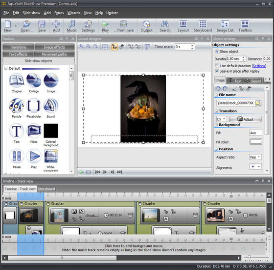 AquaSoft SlideShow Premium - инструмент для создания и просмотра домашнего видео, создания слайд-шоу из ваших цифровых фотографий для последующего просмотра получившегося результата по телевизору. Создавайте профессиональные слайд шоу без каких-либо перерывов для DVD и компьютеров. Переворачивайте картинки, коллажи, объекты и статьи, устанавливайте эффекты перехода и эффекты увеличения, анимируйте используя панораму камеры и пути движения. Стыкуйте и анимируйте картинки с помощью эффекта прозрачности. Высококачественный WMV вывод в соответствии с HD-DVD стандартом, более чем 100 текстовых эффектов с поддержкой Unicode для экзотичных языков и шрифтов.