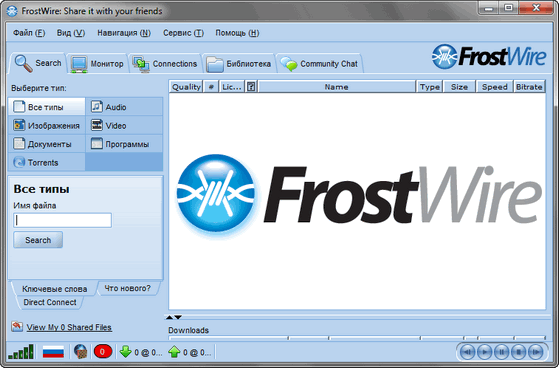 FrostWire - клиент пиринговых сетей, детище известной и популярной программы LimeWire, которое также как и его предшественница позволяет обмениваться файлами между пользователями, но имеет один большой плюс - не содержит блокиратора распространения "пиратских" файлов.