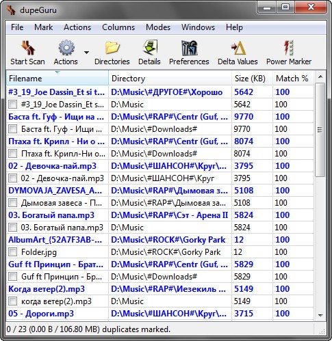 dupeGuru – сервисная программа для обнаружения дублированных файлов на вашем компьютере. Данная программа может сканировать по именам файла и по содержимому. Сканирование по имени файла представлено умным алгоритмом отмечания, который позволяет найти дублированные имена файлов даже когда они не совсем одинаковые. Вы сможете найти все дубликаты за несколько минут, благодаря встроенному алгоритму пометок.