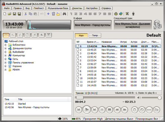 RadioBOSS - это программа для автоматизации эфира радиостанций, клубов, дискотек, казино, магазинов, кинотеатров. Широкие возможности программы позволяют использовать ее везде, где требуется музыкальное оформление. Программа может работать месяцами без вмешательства человека. Встроенный перекодировщик форматов, граббер CD, музыкальная база, генератор плейлистов, расписание, авторегулятор громкости, кроссфейды и множество других функций делают эту программу очень полезным средством для управления вашей музыкальной коллекцией. Простой и удобный интерфейс позволит Вам начать работу сразу же после запуска программы.