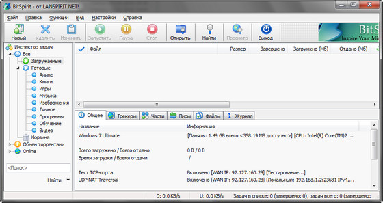 BitSpirit - мощный и удобный в использовании клиент BitTorrent, который не только работает по этому протоколу, но также имеет ряд дополнительных возможностей. Среди них следует отметить: удобный и понятный интерфейс, возможность работы сразу с несколькими закачками, механизм кеширования данных на диск, быстрое восстановление работы, поддержка выбора файлов, удобный файловый менеджер, поддержка опции обмены сообщениями, компрессия по алгоритму GZip, работа по расписанию, интеграция в IE, поддержка HTTP/SOCKS4/5 Proxy, малая требовательность к ресурсам ПК.