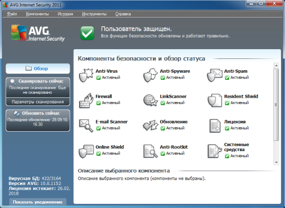AVG Internet Security - мощный пакет приложений компании GrisоfТ для защиты компьютера от всевозможных сетевых угроз: вирусов, троянов, червей, шпионского и рекламного обеспечений, хакеров и спама. В AVG Internet Security входят модули: Anti-Virus, Anti-Spyware, Anti-Spam и Firewall. Программа легка в использовании, имеет функцию автоматического обновления через Интернет и работы по расписанию. Программа AVG Internet Security 2011 имеет несколько уровней защиты, которые обеспечивают безопасность при совершении покупок, работе с интернет-банком, общении в социальных сетях и просмотре веб-страниц.
