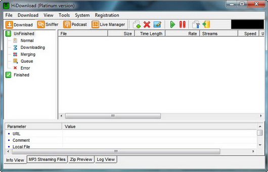 HiDownload - менеджер загрузок. Поддерживает работу по протоколам HTTP, FTP, RTSP (Windows Media), PNM, MMST и MMSU (это значит, что потоковое аудио - RA, RM и Apple Quicktime Streaming - можно "скачать" без проблем). Может работать через прокси, позволяет просматривать архивы и скачивать из них только необходимые файлы, позволяет сохранять Flash, имеется встроенный поиск MP3-файлов. Кстати говоря, есть у этой программы и внутренний поиск.