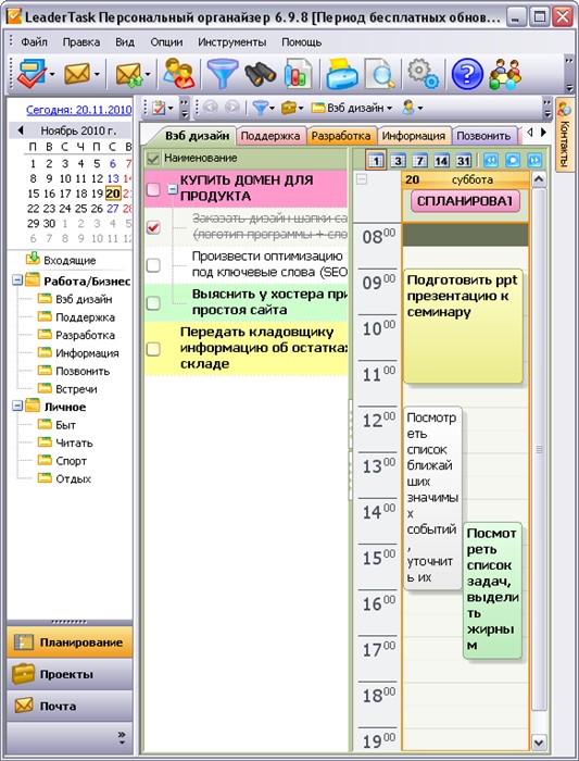 - Составление плана работы на день. LeaderTask поможет создать почасовое расписание задача на день.