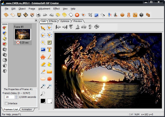 EximiousSoft GIF Creator - мощная, надежная и простая в использовании программа для создания анимированных GIF изображений, включая баннеры и аватары. Несмотря на небольшой размер, программа имеет многочисленные инструменты, позволяющие не только создавать новое изображение непосредственно в окне редактора, но и использовать для этого готовые видеофайлы и секвенцию графических файлов. Эта программа поддерживает множество форматов, включая GIF, AVI, BMP, PCX, JPG, TIFF, PNG, TGA, PSD, ICO, CUR, ANI, SWF и другие. Программа позволяет пользователю работать со слоями изображений, а также накладывать эффекты на выбранные изображения, а также изменять яркость, контраст и насыщенность картинки. Кроме того, с помощью этого инструмента вы сможете максимально оптимизировать качество изображения для уменьшения размера готового файла анимации. Интерфейс программы удобен и прост в использовании.