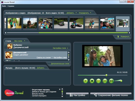 muvee Reveal позволяет быстро и легко создавать фильмы и слайд-шоу из фотографий и видео. Нужен тем, кто не привык заморачиваться тонкостями видео монтажа. Просто добавьте видео, изображения, любимую музыку и выберите предварительно созданный стиль, все остальное программа сделает сама. Программа поддерживает работу с любыми форматами видео, а также с видео высокой четкости разрешения (1280x720, 1920x1080) и в видео форматами PAL и NTSC. Также позволяет добавить в процессе видео монтажа закадровый текст, музыку.