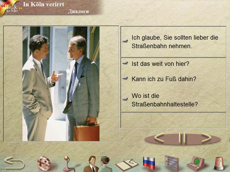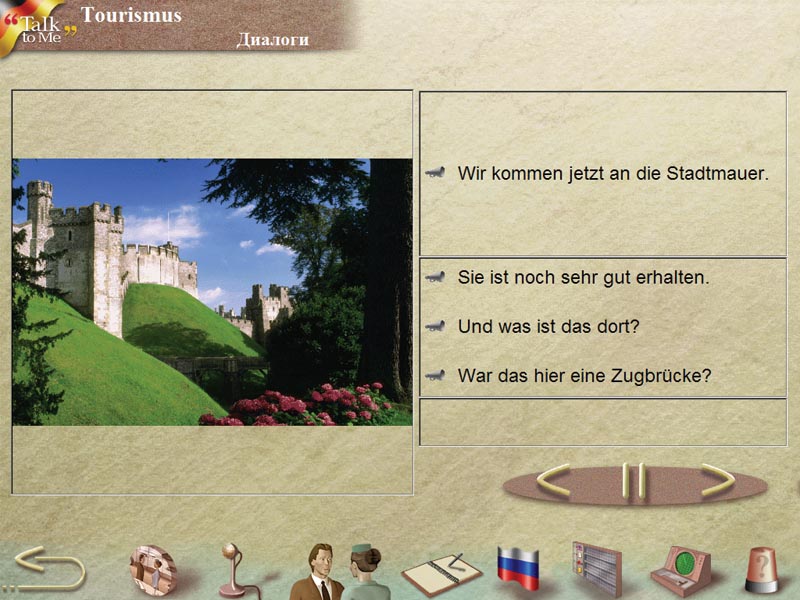 Talk to Me – интерактивный компьютерный курс для изучения немецкого языка. Новейшие мультимедийные технологии помогают быстро и эффективно освоить восприятие устной речи, поставить правильное произношение и обучить беглому говорению. Занятия с Talk to Me развивают все речевые навыки и умения и будут интересны людям разного возраста.
