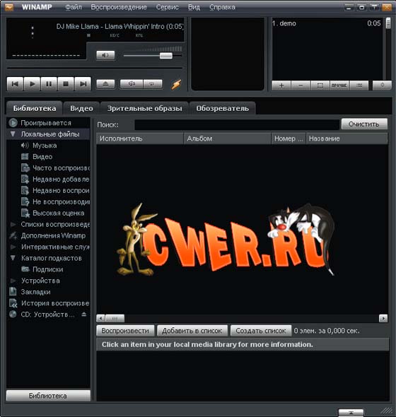 - Библиотека мультимедиа. Храните и проводите поиск ваших мультимедиа-файлов в одном месте. Возможность записи файлов из CD на компьютер и из компьютера на CD. Редактирование тэгов музыкальных файлов (исполнитель, композиция, альбом и др.). Доступ к интернет-радио и TV. Дополнительная информация (дискография, биография, обложки альбомов) о ваших любимых исполнителях и группах в плеере Winamp.