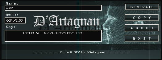 7. После этого вставьте скопированный код в строку HWID в окне кейгена. В строку Name введите латиницей любое имя и нажмите кнопку GENERATE: