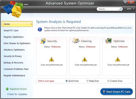 Advanced System Optimizer has a collection of new utilities to give you better gaming environment, keep your drivers up-to-date, protect your computer from spyware, and tweak settings to improve performance. The exquisite interface and the single click solution can make your working simpler.