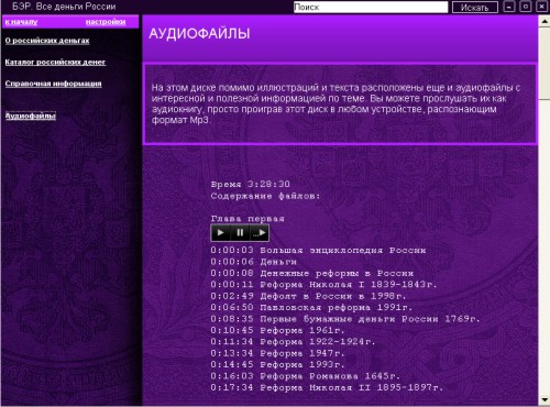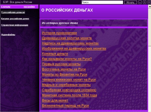 В занимательных фактах, легендах и научной информации представлена хронология событий становления российской экономики, реформ, проведенных величайшими фигурами разных эпох: Еленой Глинской, Алексеем Михайловичем, Петром I, Николаем I... В материалах энциклопедии Вы найдете подробное описание памятных монет Банка России, сможете прикоснуться к миру собирателей старинных денег, познакомиться с основными понятиями нумизматики и другой полезной информацией. Энциклопедия хранит в себе «каталог русских денег», в котором описано более 350 старинных монет и бумажных купюр СССР и России. Иллюстрированное энциклопедическое издание адресовано любителям нумизматики и всем, кто интересуется отечественной историей и культурой. Диск содержит также аудиостатьи.