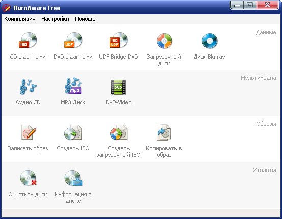 BurnAware Free - относительно небольшая, бесплатная и простая в использовании программа для записи информации и музыкальных композиций на CD, DVD, Blu-Ray и HD-DVD диски, которая пригодится как опытным пользователям, так и новичкам. BurnAware поддерживает работу со всеми типа оптических дисков (включая CD-R/RW, DVD-R/RW, DVD+R/RW, BD-R/RE, HD-DVD-R/RW и DVD-RAM) и аппаратными устройствами записи. Утилита поддерживает создание образов, способна писать мультисессионные диски, имеет опцию проверки записанного содержимого, работает под операционными системами Windows 98/ME/NT/2000/XP/Vista (32/64-bits).