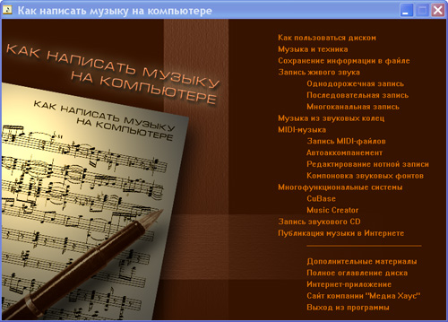 Эта программа шаг за шагом познакомит Вас с основами создания музыкальных композиций, записи и редактирования звука и голоса, работы с "живыми" инструментами и многим другим. Также Вы узнаете о программах и технических устройствах, необходимых начинающему композитору, аранжировщику и звукорежиссеру. Удобный интерфейс и подробные объяснения с иллюстрациями, делают работу с программой удобной и эффективной.