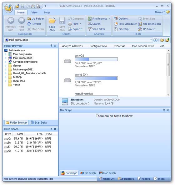 Эта программа позволит вам провести проверку жестких дисков на наличие на них свободного места. Если вы никак не можете понять, почему места осталось так мало, запустите FolderSizes Pro, и программа создаст для вас полный отчет. Программа сгенерирует диаграммы, которые наглядно покажет, какие папки занимают больше всего места. Среди возможностей программы: Распечатка отчетов, экспорт их в HTML; Экспорт диаграмм в файлы JPEG, PNG, BMP или TIFF; Система создания отчетов по типам файлов, которые занимают больше всего места.