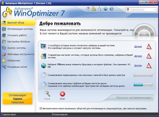 Ashampoo WinOptimizer - новая 7ая линейка пакета программ, позволяющего оптимизировать операционную систему за счет ее настройки и очистки. Включает в себя утилиты для очистки жесткого диска и системного реестра, модуль для обеспечения защиты личной информации путем поиска и удаления файлов и данных, оставшихся после интернет-cepфингa, утилиту для оптимизации интернет-соединения, модуль для настройки программ, автозагружаемых одновременно с запуском системы, а также модули для поиска и удаления ненужных файлов DLL, для безвозвратного удаления данных и для шифрования файлов. Кроме этого, программа позволяет переназначать ассоциации файлов, шифровать и расшифровывать файлы, а также безвозвратно их удалять. Наконец, возможна настройка параметров системы и ее оптимизация за один клик. В шестой версии программы появилось немало новых возможностей, новые модули, включая новый антишпионский модуль и менеджер контекстного меню Windows, а также множество улучшений и исправлений.