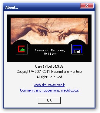 Cain & Abel is a password recovery tool for Microsoft Operating Systems. It allows easy recovery of various kind of passwords by sniffing the network, cracking encrypted passwords using Dictionary, Brute-Force and Cryptanalysis attacks, recording VoIP conversations, decoding scrambled passwords, revealing password boxes, uncovering cached passwords and analyzing routing protocols. The program does not exploit any software vulnerabilities or bugs that could not be fixed with little effort. It covers some security aspects/weakness present in protocol's standards, authentication methods and caching mechanisms; its main purpose is the simplified recovery of passwords and credentials from various sources, however it also ships some "non standard" utilities for Microsoft Windows users.