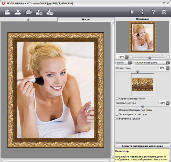 ArtSuite поможет создать поздравительную открытку, праздничный альбом, плакат или календарь, оформить изображение в рамку, превратить цветное современное фото в стилизованный черно-белый портрет и даже осуществить цветокоррекцию. Дополнительно предлагаются тематический пакет из 30 рамок, разработанные профессиональными художниками специально для программы ArtSuite.