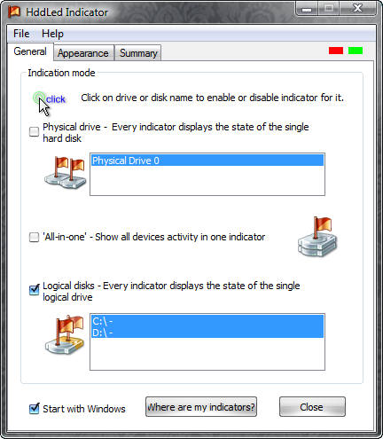 With HddLed Indicator you can select which of the logical disks or hard drives you want to look after. And dynamic tips will get more information about rate and amount of transferred data.