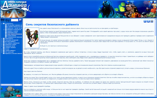 Здесь вы найдете описания наиболее интересных географических точек погружений, затонувших кораблей, знаменитых коралловых рифов, подводных обитателей, которых можно встретить в том или ином месте. Вы узнаете о физиологических показаниях при погружении, получите советы по выбору и использованию снаряжения, изучите правила и секреты безопасного дайвинга. Видеосюжеты и интересные факты о дайвинге – все это и многое другое вы найдете в данном мультимедийном издании.