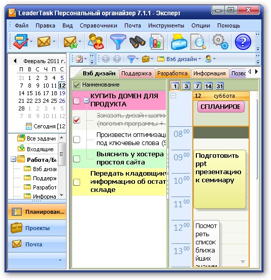 LeaderTask - это умный органайзер для лидеров! Интеллектуальная система управления проектами, событиями, задачами, контактами, освободит вас от рутины и даст больше времени для творчества. LeaderTask поможет вам избавиться от различных поглотителей времени, поможет вам увидеть четкую перспективу жизни, иметь подробный обзор дел, задач, вы будете ставить более высокие цели и достигать их. Кроме того, LeaderTask - это еще и удобный менеджер проектов, с помощью которого можно легко планировать и управлять вашими личными делами, а также бизнес проектами.